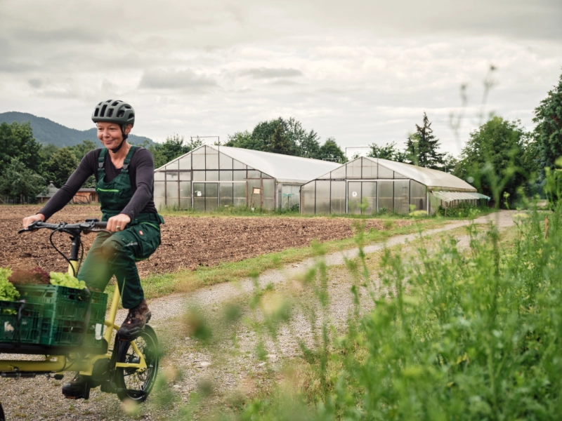 Jobradlerin verstaut ihren Einkauf im Lastenrad