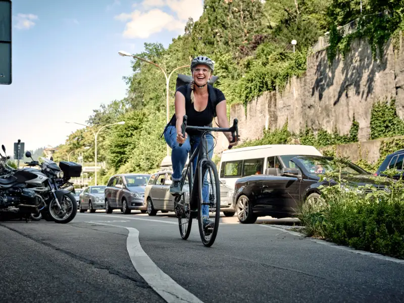 JobRadlerin fährt am Stau vorbei | Presse Downloadbereich